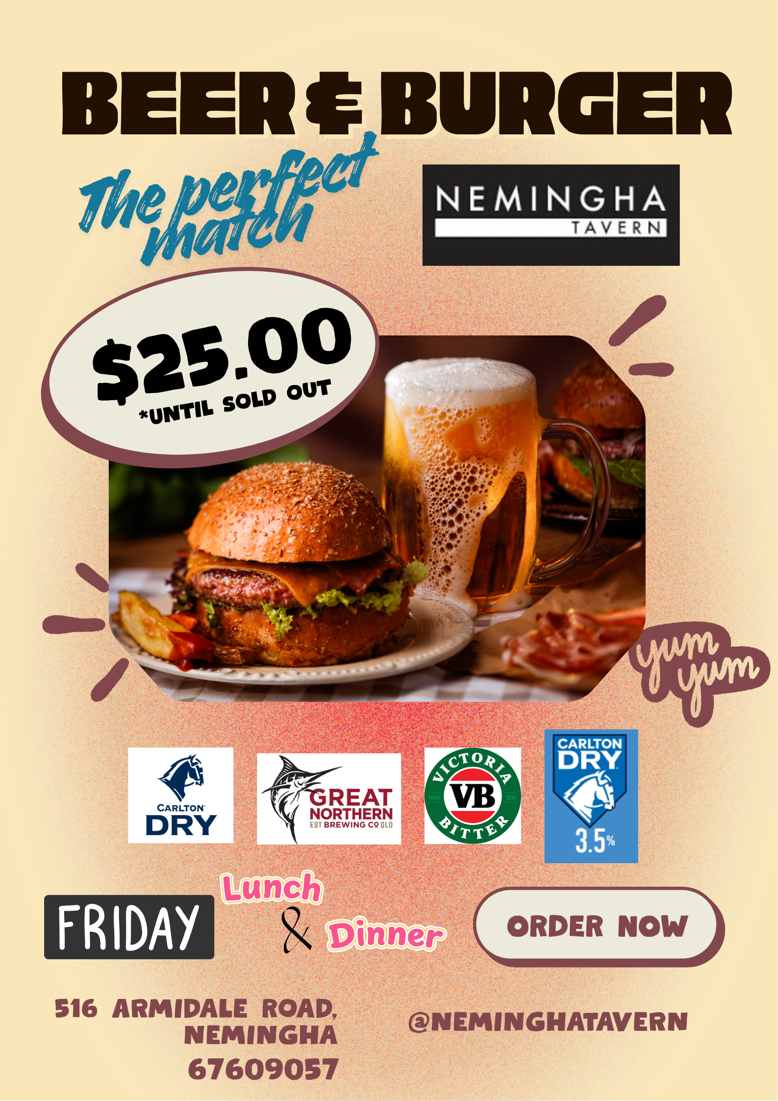At Nemingha Tavern in Tamworth, there’s always something delicious on offer. Our daily and weekly specials give locals and visitors alike a reason to drop by—whether it’s for a hearty pub classic, a fresh seasonal dish, raffles, giveaways or the friendly atmosphere in our historical pub.